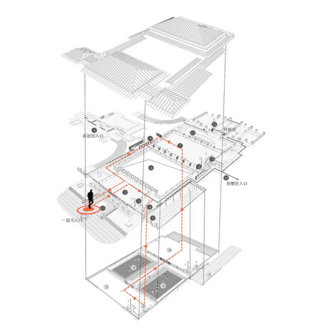 示范区占地面积接近10,000平方米、计容面积1,150平方米,为了体现王府气派,在中庭设计中采取下沉庭院的设计,最大限度的利用它面积的功能,让人充分体验示范区的空间变换,体会“璞樾春秋”的皇家王府气质。