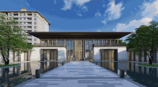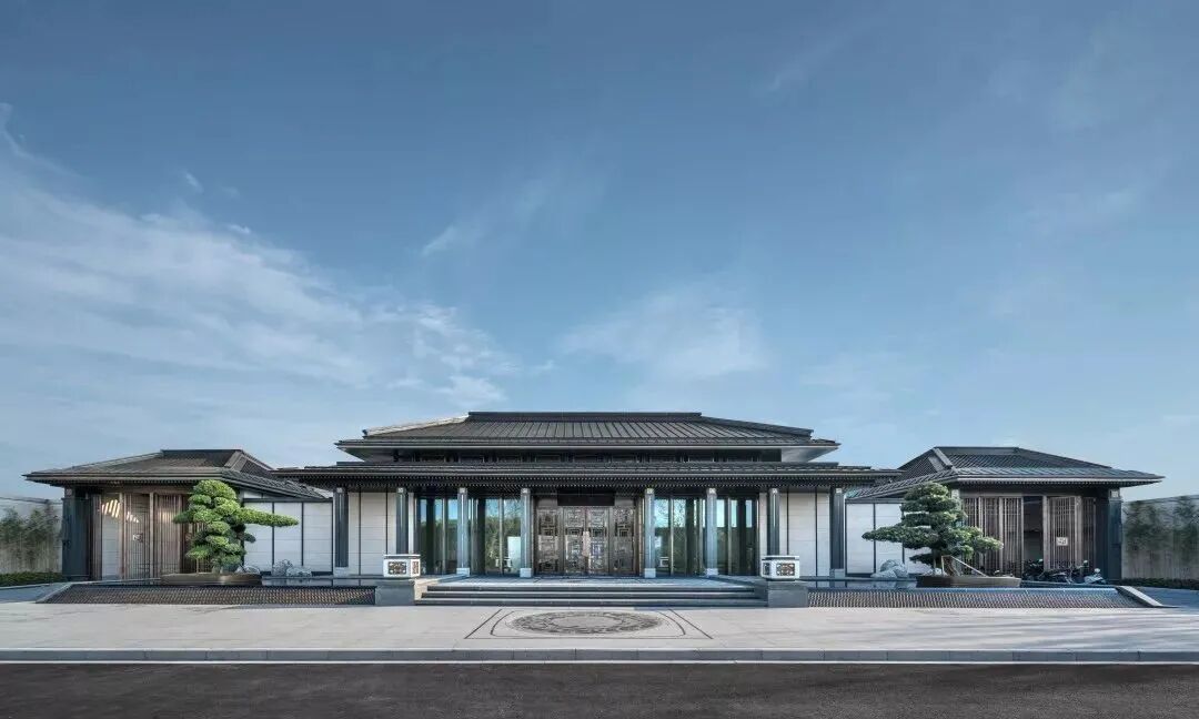 示范区前场,取法于故宫太和殿,两侧门楼与中部入口主殿,中轴对称,强调横向展开的韵律,营造充满气势的前场效果,塑造王府大宅之气。