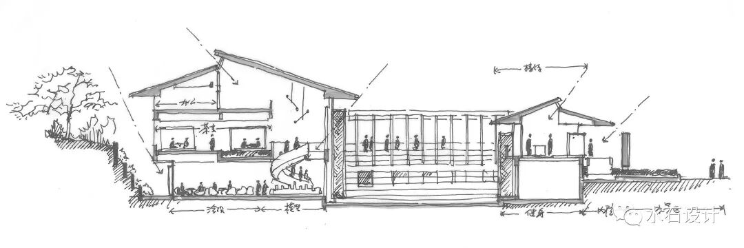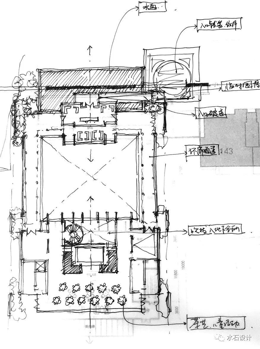 示范区中部,取四水归堂之意,打造大尺度的下沉庭院。两侧设计景观水帘,是整个设计中的空间亮点。