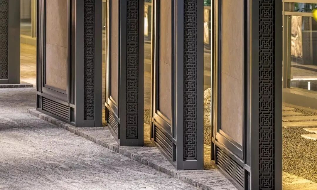 两侧连廊采用定制的山水画屏风,为保证单边悬挑连廊的结构稳定性与屏风尽量做薄的厚度要求达到平衡,其构造做法进行了多次设计讨论。