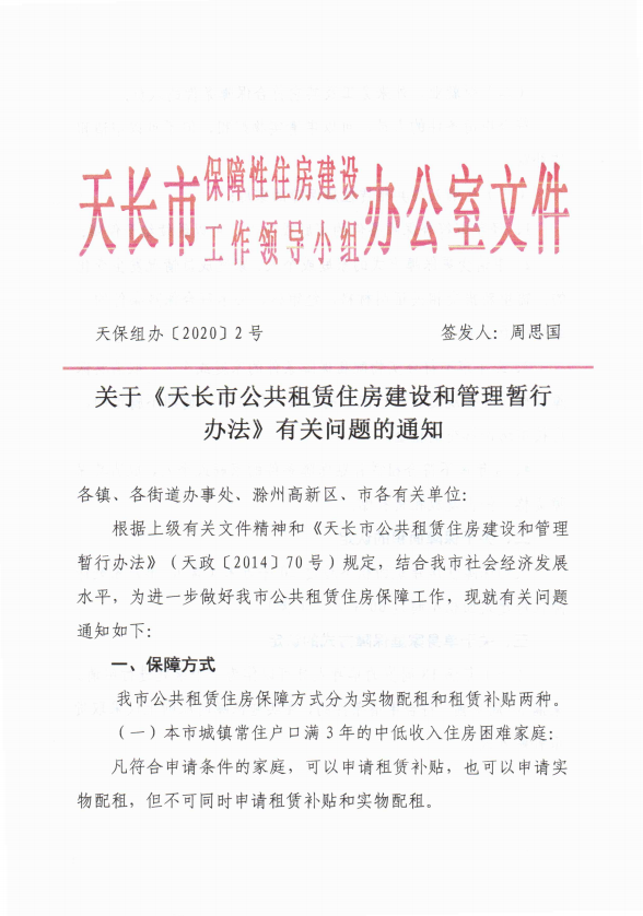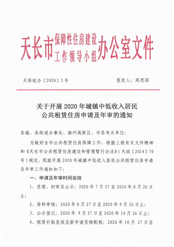 关于《天长市公共租赁住房建设和管理暂行办法》有关问题的通知关于开展2020年城镇中低收入居民公共租赁住房申请及年审的通知