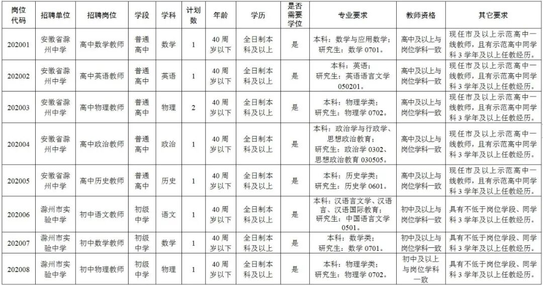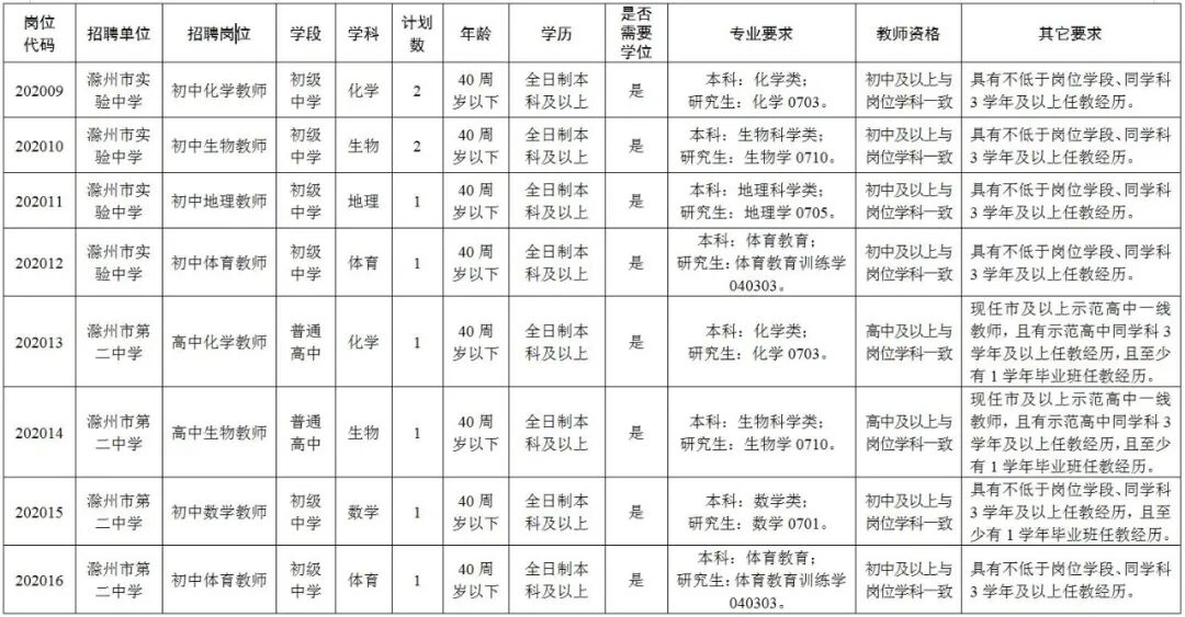 为加强市直中学教师队伍建设,应对新课改新高考教学需要和市直中学教育教学质量提升需求,经市人社局核准,现面向全国公开选调在编在岗教师。公告如下: 一、选调范围 全国(不含滁州市市直)公办普通中学在编在岗教师。 二、选调岗位计划