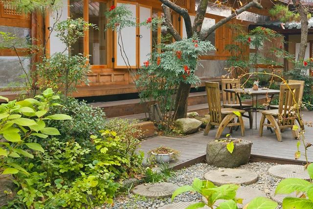 如果你住一楼或是合院有面积较大的庭院,可结合乔木、灌木及附着于地表的植被一同布置,让所有花木相映成趣,富于层次;或者增加一个水景、小花坛平添更多野趣,闲暇时看花草摇曳,听雨打芭蕉,打造一个更为赏心悦目的“秘密花园”。